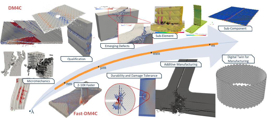 The Discrete Model for Composites (DM4C) and its advanced extension, Fast-DM4C, represent a significant advancement in the computational modeling of complex, highly heterogeneous composite materials. As an extension of the Lattice Discrete Particle Method (LDPM), DM4C is specifically tailored for these materials. The explicit use of Timoshenko Beams to represent the material’s structural elements offers both computational efficiency and dexterity for solving problems across the multiscale paradigm. This efficiency facilitates simulations that effectively account for hundreds to thousands of individual fibers, “superfibers” (conceptual aggregations of multiple fibers), or larger structural units such as tows and rasters. This innovative approach enables DM4C and Fast-DM4C to accurately represent and simulate a wide array of composite architectures, including individual lamina, intricate laminate structures, various textile composites, and materials produced through additive manufacturing processes. This multi-scale capability is critical for a comprehensive understanding of composite material behavior, encompassing initial material design and optimization, prediction of failure mechanisms, and overall structural integrity seen in Aerospace applications.